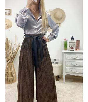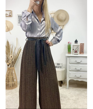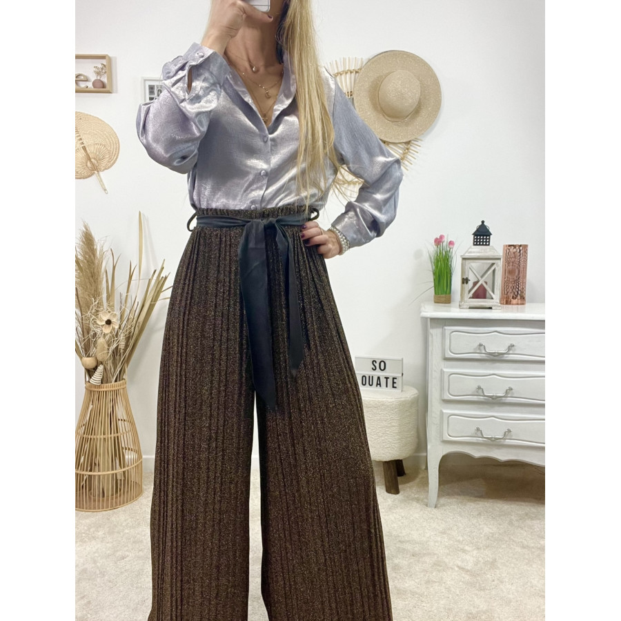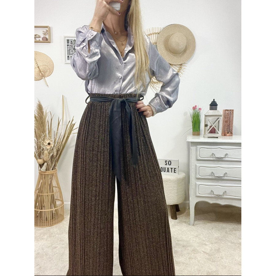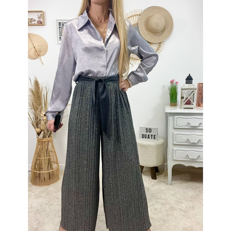 * Pantalon plissé et pailleté, coupe palazzo avec ceinture ruban noir