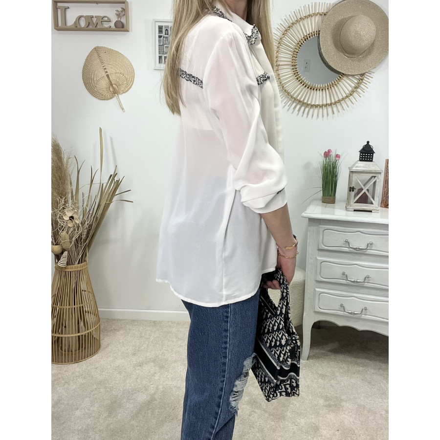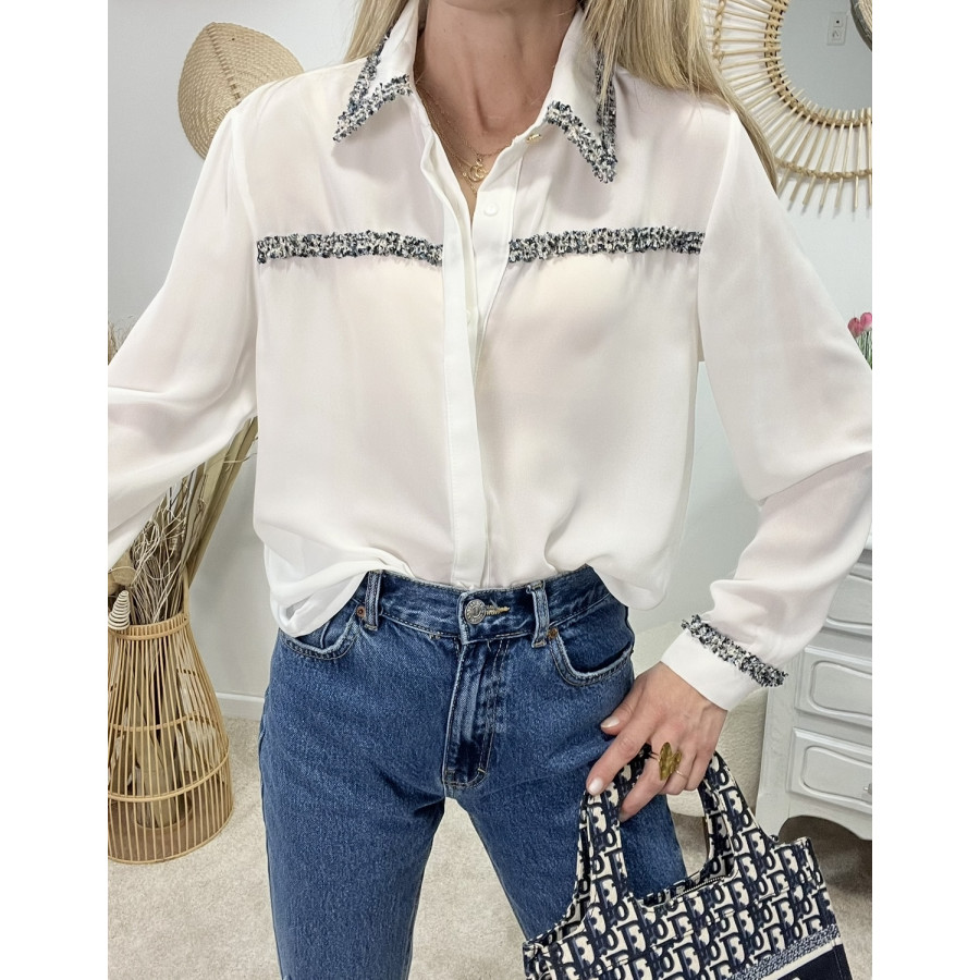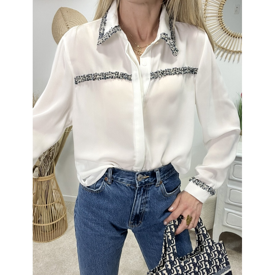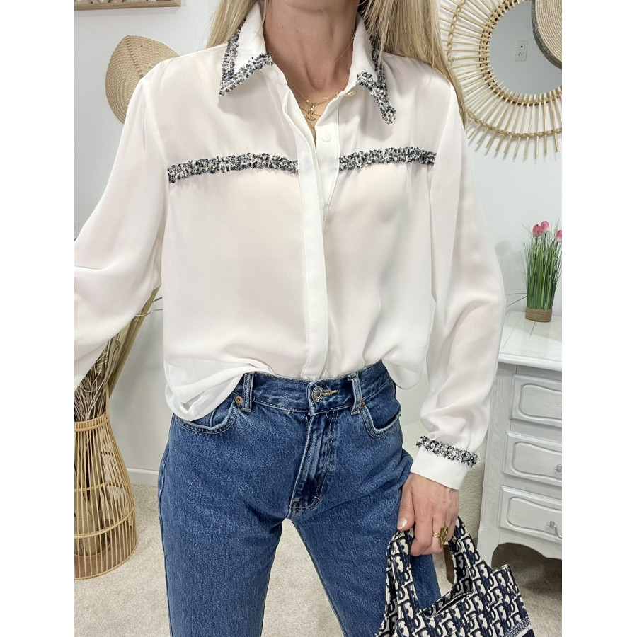 * Chemisier en mousseline blanc avec empiècement en tweed sur la poitrine et le col