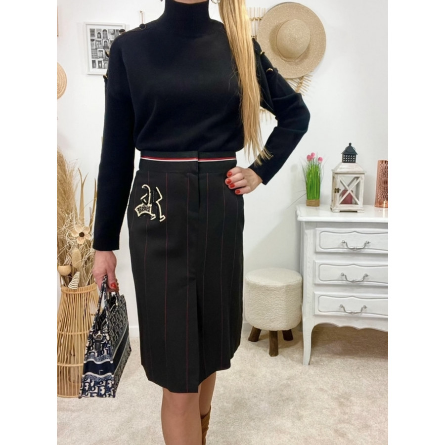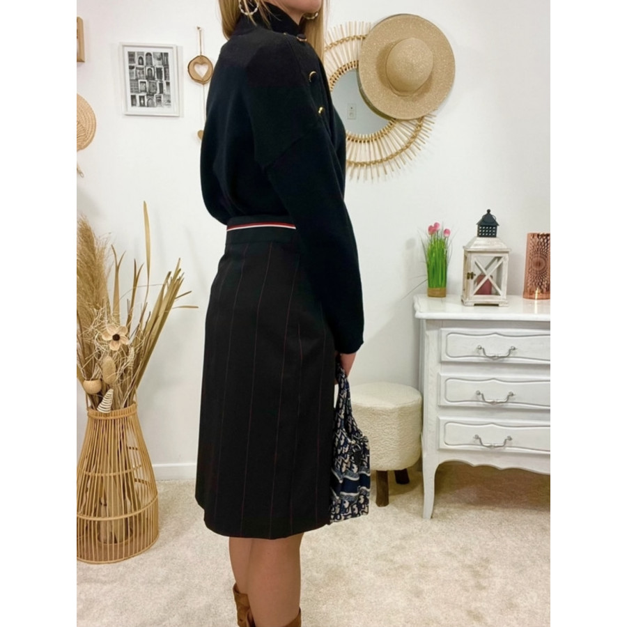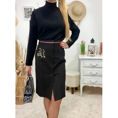 * Jupe noire avec fines rayures rouge, taille liseré rouge/blanc, empiècement en sequins